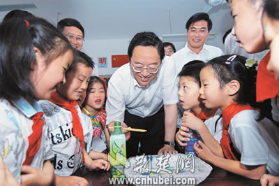 6月1日,武漢市武昌區(qū)為民小學(xué)。兩棵高大的榆樹(shù)在小小的院子灑滿(mǎn)了濃陰,一群孩子活蹦亂跳玩著游戲。省委書(shū)記俞正聲滿(mǎn)面春風(fēng)地來(lái)到了孩子們中間。