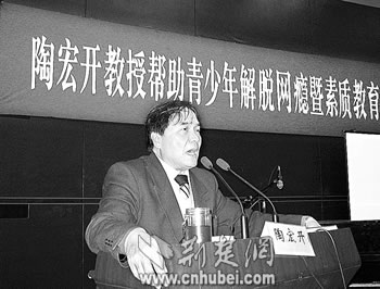 一襲并不時(shí)尚的米色風(fēng)衣,一套普通的深色西裝,中等身材,高額闊臉,面色健康,頭發(fā)略有花白?烊丝煺Z(yǔ),不時(shí)夾雜幾句“Yes”“No”,講到激動(dòng)處有些口吃。這便是“青少年網(wǎng)絡(luò)愛(ài)心大使”、59歲的華中師范大學(xué)特聘教授陶宏開(kāi)。從間接了解,到直接接觸,從報(bào)告會(huì)、座談會(huì),到面對(duì)面采訪,連日來(lái),記者就這樣走近陶宏開(kāi)——