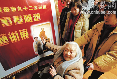 “這是特意為您準(zhǔn)備的生日禮物!”年過(guò)六旬的盧永瀚攙扶著92歲的母親,在根雕、油畫(huà)面前仔細(xì)講解!斑@個(gè)根雕是壽字!”孫女插話說(shuō):“就是祝您長(zhǎng)壽,活過(guò)100歲!”慧老太太邊看邊比劃著,樂(lè)得合不攏嘴,用濃重的江浙口音說(shuō):“好、好!”