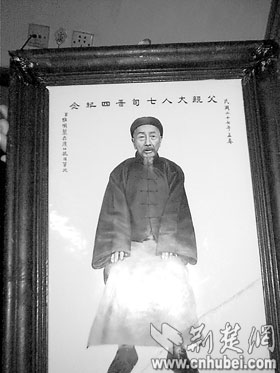 昨日,記者在湖北省社會科學院劉女士家中,見到了這塊漢繪瓷板畫。白色的瓷板鑲嵌在木制相框中,瓷板畫中間是一幅手工繪就的人像,畫中老人正襟危坐,含威不露,瓷板上端是“父親大人七旬晉四紀念”,右批為“民國二十七年孟春”,左批“男惟明制于漢口抗日軍次”,下端有“漢口榮康瓷業(yè)公司精繪”的小字(如圖)。
