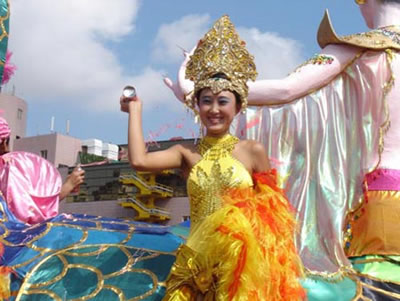 今天上午在新海廣場舉行的第六屆大連狂歡節(jié),更是使歡樂的海洋里掀起了歡樂的海潮。來自國內(nèi)外的24支狂歡巡游隊伍,以花團錦簇的民族服裝和極度夸張的藝術(shù)手法,演繹了航天、花神、特洛伊木馬、梁山伯與祝英臺、孔雀仙子、海底動物、蝴蝶服飾、阿凡提、醉酒、美人魚、回娘家、貓友、豪華游覽馬車、日月潭傳說、堂吉訶德、木偶奇遇、狐假虎威、寶蓮燈、海娃與王子、小櫻丸子、尼爾斯騎鵝記、阿里巴巴、輪滑表演等國內(nèi)外著名童話,電影故事等。最為耀眼的是以音樂劇《貓》的扮相出場的表演隊伍,他們獨特的表演和造型贏得了在場觀眾最多的歡呼聲?駳g的服裝藝術(shù)巡游,吸引了數(shù)萬國內(nèi)外游客和當?shù)孛癖姷挠^賞。