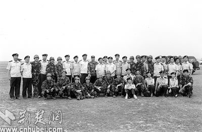 我國首批宇航員在駐鄂空降兵某部圓滿完成傘訓(xùn)任務(wù)后,與部分傘訓(xùn)保障人員合影。前排左二為聶海勝,后排右六為費俊龍,后排左六為楊利偉。