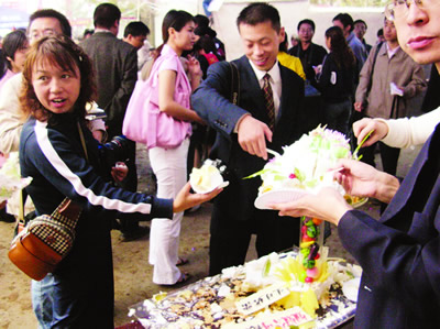 這個匠心獨運的蛋糕由妞妞公司制作贈送。其主體部分是一條飛龍,并書有“飛龍在天”字樣。飛龍一側(cè),則是一只“神舟六號”航天飛船模型。
