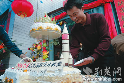 A special birthday party was held in Zaoyang of central China’s Hubei Province, Nie’s hometown. A local food company specially made a birthday cake with a decorative pattern of the Shenzhou-6 for Nie. “We are proud of Nie Haisheng and wished him a happy birthday”, Song Aijie, a working staff of the company said.