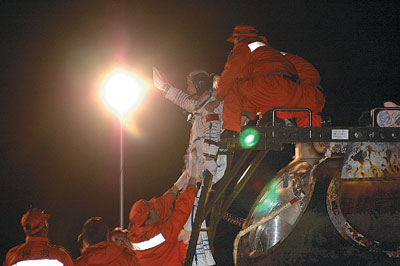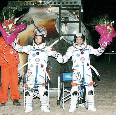 轉(zhuǎn)眼之間,艙門已被打開。費(fèi)俊龍、聶海勝向人們揮動(dòng)著手臂,輕快出艙。細(xì)心的工作人員,已經(jīng)在艙門外為他們擺好了兩把椅子。