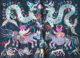 魯繡 魯繡——山東地區(qū)的代表性刺繡,是歷史文獻中記載最早的一個繡種,屬中國“八大名繡”之一。 “齊紈”、“魯縞”早在春秋戰(zhàn)國時期已是全國聞名的產品。當時齊國有“冠帶衣履天下”的盛譽。據(jù)《論衡》記載:“齊郡刺繡,恒女無不能者,目是而手狎也”。 從唐代后期,我國北方連年戰(zhàn)亂,桑地及織繡生產受到嚴重破壞,若干織繡工人遷徙南方,北方刺繡長期衰落。直至明代后期,魯繡又聞名于世,達到高度水平。 現(xiàn)在臨淄考古組存有東周時期的刺繡殘片,鄒縣文物保管所存有元代的魯繡珍品,故宮博物院存有較多的明代魯繡,如《百鳥朝鳳圖》、 《羅漢圖》,其構圖嚴謹,手法多樣,花紋粗獷雄健,質地堅實,色彩對比強烈,形象生動,是魯繡杰出的代表作。 魯繡主要特點是:構圖簡練樸實、色彩明亮對比強烈,針法粗細相間,極富裝飾性和立體感,既華麗而又素雅。其代表產品主要有花鳥、書法、人物。 魯繡憑其工藝精湛、構圖和色彩迷人受到了全世界人們的寵愛。早在兩千年前的漢朝,魯繡就通過絲綢之路傳到西亞,轉而傳向歐洲的羅馬帝國。目前,刺繡已出口到一百多個國家和地區(qū),成為中國刺繡文化與和平藝術的使者。 汴繡 汴繡,也稱宋繡,距今已有八百余年歷史,是我國名繡之一,素有"國寶"之稱。它以繡工精致,針法細密,圖案嚴謹,格調高雅,色彩、秀麗而著稱,早在宋代就已馳名全國。據(jù)記載:北宋時期已有"文繡院"。當時皇帝的龍袍、官員的朝服、烏紗帽、朝靴都為刺繡精品。據(jù)《東京夢華錄》載,民間刺繡也極為興盛,到處"繡簾相拓"、"錦繡交輝"。宋代刺繡工藝已發(fā)展到相當水平,據(jù)明代屠龍《畫箋》所載,"宋之閨繡畫……女紅之巧,十指春風,迥不可及'。北宋滅亡,汴繡遭動一蹶不振。 為了繼承宋代閨繡這一傳統(tǒng)工藝,開封汴繡廠于一九五四年成立。建廠后,新老藝人在繼承傳統(tǒng)工藝的基礎上,錄蹤探微,博采眾家之長,反復試驗,在傳統(tǒng)的以平針為主的技藝之上,又創(chuàng)新了散針、亂針、滾針、水紋蒙針等幾十種針法。多種針法的交替使用,不僅能把陰陽遠近一一表現(xiàn)出來,而且表現(xiàn)內容豐富,富有立體感。汴繡針法既長于刺繡花鳥蟲魚飛禽走獸,又善于創(chuàng)作氣勢磅礴的山水圖景,刻畫人物形象更是細致傳神。繡品既具有蘇雅潔活潑的風格,又具有粵繡明快豪放的特點。1959年汴繡《清明上河圖》繡成,作為國慶十周年獻禮,陳列在人民大會堂,它以針代筆,以線代暈,使這幅宏偉浩繁的歷史風俗畫卷逼真地展現(xiàn)在人們眼前。作品展覽時,中外客人無不嘆服。 改革開放以來,汴繡工藝又得到進一步的發(fā)展與創(chuàng)新,精品選出,如《清明上河圖》、《百駿圖》、《五牛圖》、《韓熙載夜宴圖》、《簪花仕女圖》等繡品均為國家收藏或被國外友人重金購去。此外,汴繡除刺繡之外,還有單面繡、雙面繡、三異繡及大量機繡產品,品種繁多,題材廣泛。 漢繡 漢繡主要流行于荊沙、武漢、洪湖一帶。漢繡作品曾多次在京展出,還參加了巴黎、華沙等國際展覽,受到好評。 漢繡,以楚繡為基礎,融匯南北諸家繡法之長,揉合出了富有鮮明地方特色的新繡法。它的用針有別于四大名繡……蘇繡、蜀繡、湘繡和廣繡,采用一套鋪、平、織、間、壓、纜、摻、盤、套、墊、扣的針法,以“平金夾繡”為主要表現(xiàn)形式,分層破色、層次分明,對比強烈。追求充實豐滿、富麗堂皇的熱鬧氣氛,繡品可以枝上生花,花上生葉,葉上還可出枝,充分體現(xiàn)了“花無正果,熱鬧為先”的美學思想,呈現(xiàn)出渾厚、富麗的色彩。 從春秋中期到戰(zhàn)國時,楚國的刺繡品已遠銷到西伯利亞地區(qū),可見其刺繡業(yè)之發(fā)達。南方的楚國絲織業(yè)足以代表當時我國絲織品工藝技術的最高水平。屈原的《楚辭·招魂》為我們描繪了一幅楚宮絲織品圖畫,“翡翠珠被,爛齊光些。蒻阿拂壁,羅帳張些;纂組綺縞,結琦璜些。……翡幃翠帳,飾高堂些”,“被文服纖,麗而不奇些。”這種需求對刺繡品的生產、發(fā)展的刺激是不難想見的。同時,楚文化氛圍下民間戲曲的發(fā)達、巫風巫月術的盛行又為刺繡走向民間提供了生長的沃土。 漢繡的鼎盛期是清末民初。咸豐年間,漢口設有織繡局,集中各地繡工繡制官服和各種飾品。清末,在武昌的營坊口、塘角、白沙州、積玉橋和漢口的黃陂街、大夾街一帶,開有許多繡鋪,漢口還有一條繡花街。當時的漢繡產品主要分三類:作為生活用品的有繡衣、繡枕、門簾、帳沿、繡鞋、頭巾、圍裙、荷包等,多用于閨閣陪嫁。其中,漢口的繡花戲衣頗具名氣。二是裝飾品。有壁掛、中堂、屏風、彩帳、堂彩、龍衣、獅皮、戲裝、道具等。三是敬神賽會的禮儀用品,包括神袍、袈裟、彩幡等。 抗戰(zhàn)時期,日軍侵占武漢,漢口繡花街被燒毀,漢繡日趨凋零,技藝幾近失傳。新中國建立以后,漢繡才重放光華。80年代,漢繡產品已由原來的民用小繡品和少量古典戲劇繡服發(fā)展到帳簾、披風、被面、枕套、服裝、大幅、中堂、條屏、折頁、搖件和屏風等十多個品種。 江陵馬山一號墓發(fā)掘出的戰(zhàn)國中期繡品,進一步證實了漢繡的歷史承載量。繡線顏色以紅、黃、綠、蘭等亮色為主,繡品以密集的滿繡填充塊面,或虛出繡紋輪廓內的局部塊面,繡出的珍禽異獸、