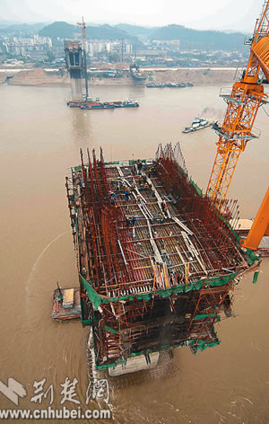 這是12號主塔墩正在進行混凝土澆筑的情景。日前,宜昌長江大橋已完成3個主塔墩的混凝土澆筑,這標志著大橋下部結(jié)構工程已基本完成,轉(zhuǎn)入梁體施工階段。宜昌長江大橋是宜萬鐵路重點工程,該橋建設的順利進行,為全路段按期建成通車打下堅實基礎。