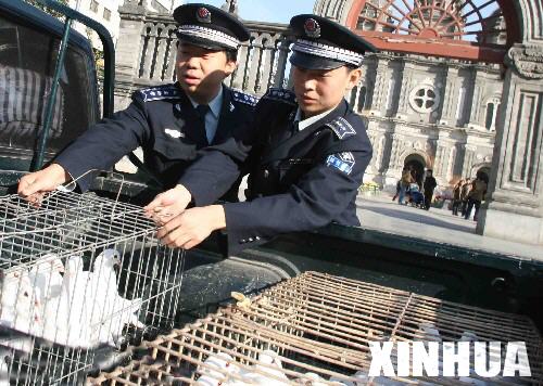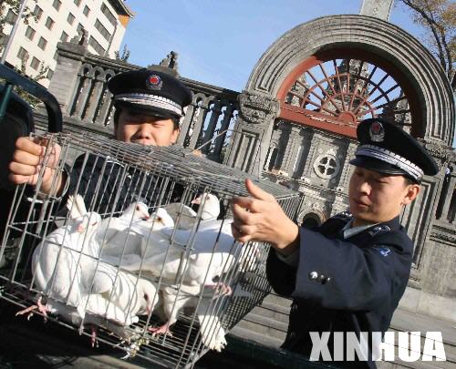 11月15日,北京市東城區(qū)城管隊員在王府井教堂的廣場前拉起一張捕鳥網(wǎng),捕捉廣場附近的野鴿子。這些野鴿子將被送到信鴿協(xié)會在昌平設(shè)立的鴿舍,待禽流感疫情解除后,再放回廣場。 新華社發(fā)(吳強 攝)