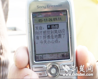用戶:ymcbz 今天上午8時45分左右,我們還以為起了大風(fēng)……有的人已經(jīng)跑到樓下:是不是有地震? 五樓的小涂說:太陽能水管在擺動……前樓的小王說:窗簾斜擺,風(fēng)鈴發(fā)聲! 家里魚缸的水晃出來了! 縣檢察院正在開會,桌上的茶杯晃動,大家都往樓下跑。 感謝荊楚網(wǎng),快速告訴了我們事實的真相!