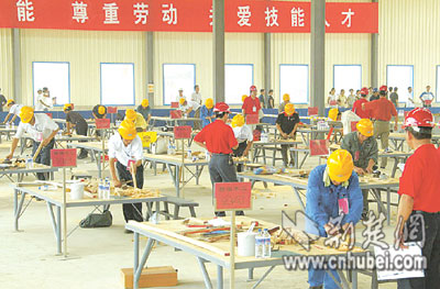 昨日,前往湖北城市建設職業(yè)技術(shù)學院藏龍島校區(qū)參賽的,除了精細木工外,還有砌筑工、鋼筋工和鑲貼工等工種,共114名選手。他們是從全省117萬建筑工人中層層選拔出來的。