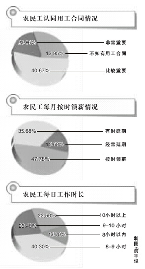 調(diào)查顯示農(nóng)民工月薪多在500到800元之間,22.5%的農(nóng)民工每日工作超10小時(shí)