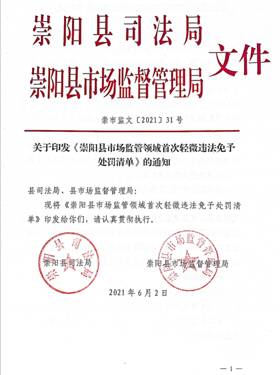 6月2日,崇陽縣司法局、縣市場監(jiān)管局在廣泛征求意見的基礎(chǔ)上,印發(fā)了《崇陽縣市場監(jiān)管領(lǐng)域首次輕微違法免予處罰清單》(2021年版)。