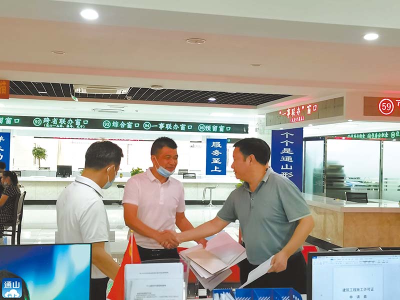 “1個(gè)地塊5個(gè)證,一共25個(gè)證,沒想到一天就能拿到手!”9月30日下午,在通山縣政務(wù)服務(wù)中心工程建設(shè)項(xiàng)目綜合審批窗口,通山縣興達(dá)鞋業(yè)有限公司經(jīng)理程宏兵從縣住建局局長(zhǎng)手中接過厚厚的一摞證,意味著通山縣興達(dá)鞋業(yè)有限公司在通山的地塊達(dá)到開工條件。