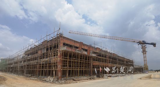 8月26日,咸寧高新區(qū)天府烤鹵施工項目現(xiàn)場,遠處巨大的場地上,鋼柱林立,刺破蒼穹,渾然列陣。