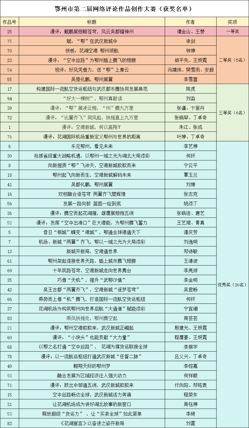 荊楚網(wǎng)(湖北日?qǐng)?bào)網(wǎng))訊(記者陶輝 通訊員陳穩(wěn)定)10月23日,鄂州市第二屆主題網(wǎng)評(píng)大賽獲獎(jiǎng)名單出爐,42件作品分別獲得一、二、三等獎(jiǎng)和優(yōu)秀獎(jiǎng)。