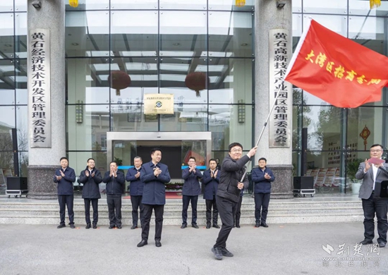 “期待你們凱旋而歸,出征!”授旗儀式上,黃石經濟技術開發(fā)區(qū)黨工委書記、管委會主任、鐵山區(qū)委書記萬鼎為大灣區(qū)招商分局、三角招商分局、武漢招商分局、鐵山街道招商專班授旗,4名招商專班負責人鄭重接過旗幟。