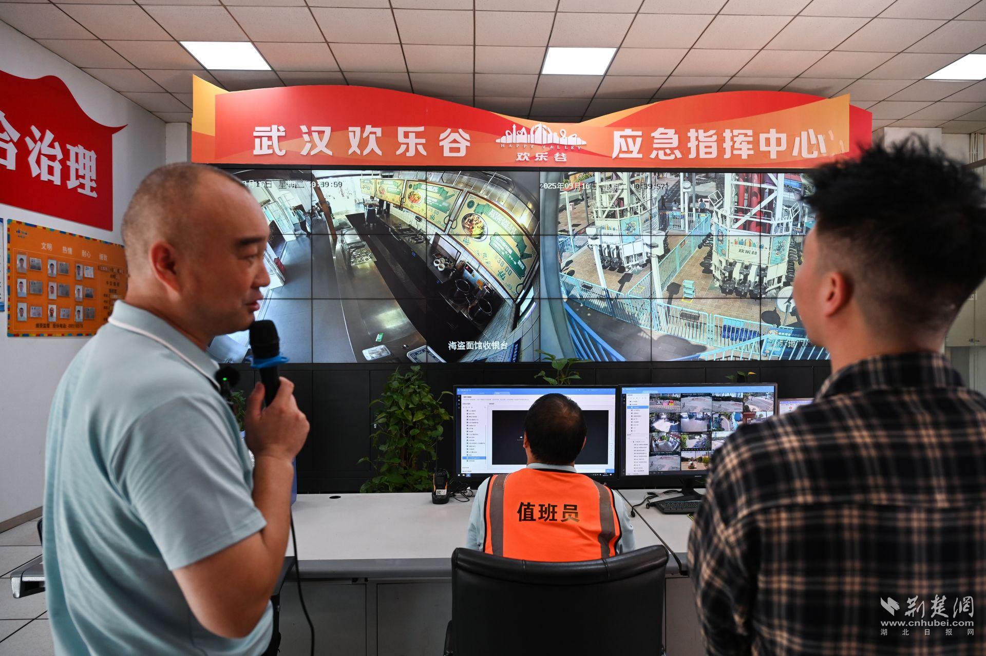 在武漢歡樂(lè)谷指揮中心,市民代表們目睹了數(shù)十個(gè)電子屏整齊排列,嚴(yán)密監(jiān)控著園區(qū)內(nèi)的各個(gè)角落。在這里,值班人員通過(guò)監(jiān)控設(shè)備的實(shí)時(shí)畫(huà)面,細(xì)致查看設(shè)備每日早檢及安全運(yùn)營(yíng)狀況,園區(qū)餐廳也借助智慧監(jiān)管平臺(tái)實(shí)現(xiàn)了透明化管理。