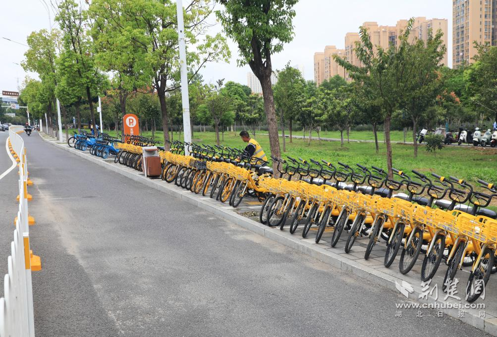 武漢輕工大學(xué)學(xué)生志愿者參與單車擺放。