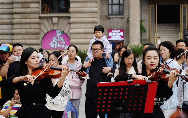 來自阿曼的游客Murad Al Balushi難掩興奮,特意讓朋友為自己和樂團拍下合影?!斑@場演出太精彩了,現(xiàn)場的氛圍讓人沉醉,武漢街頭的這份浪漫很獨特?!盡urad Al Balushi表示。來自廣東珠海的游客曹先生,剛下火車便將江漢路作為旅途第一站,而這場音樂快閃成為他此行的意外之喜?!案哐乓魳放渖习倌赙姌堑膹?fù)古建筑,氛圍感直接拉滿,這趟旅行的開頭太完美了?!蔽錆h市民李女士帶著家人在休息日出游,剛從公交站下車就被樂聲吸引,“本來就是隨便逛逛,正好帶著寶寶感受一下音樂氛圍。”江漢大學(xué)大四學(xué)生小劉和朋友一同被這場音樂“快閃”所打動,拍下視頻發(fā)朋友圈和大家分享。她表示:“武漢這座城市越來越有活力,總能給人驚喜?!?/p>