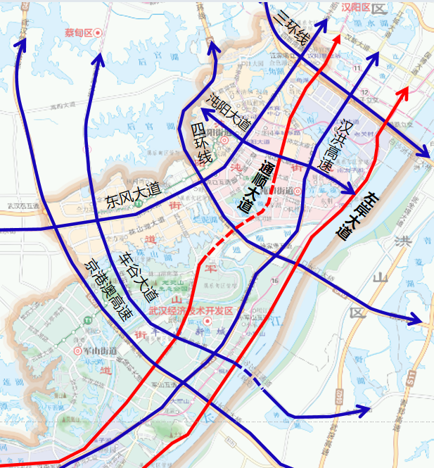 通順大道是武漢經(jīng)開區(qū)繼東風(fēng)大道、江城大道、左岸大道(沿江大道)之后連接主城區(qū)的第四條交通動(dòng)脈,也是大漢陽(yáng)片區(qū)交通一體化的重要組成部分。