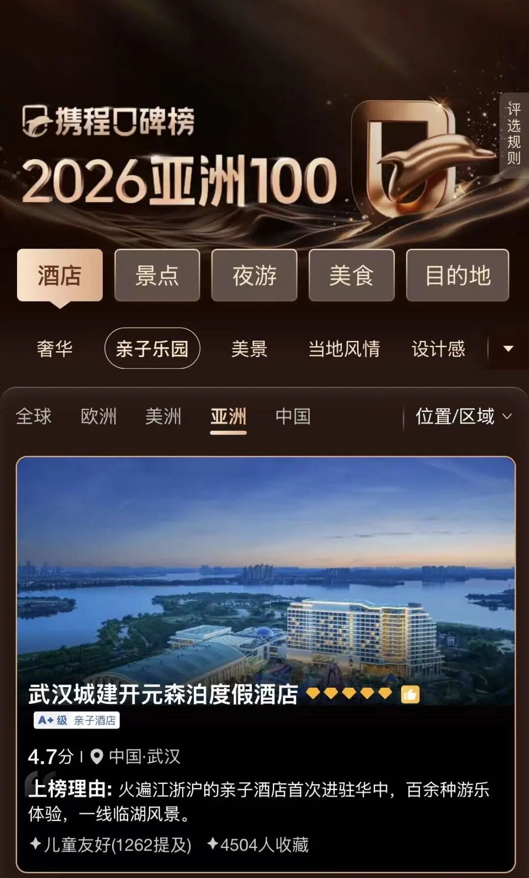 近日,攜程平臺(tái)發(fā)布《攜程口碑榜2026年度榜單》,武漢城建開元森泊度假酒店成功上榜亞洲親子樂園酒店百強(qiáng),位列亞洲第58位、國(guó)內(nèi)第29位,成為湖北省唯一上榜的酒店。