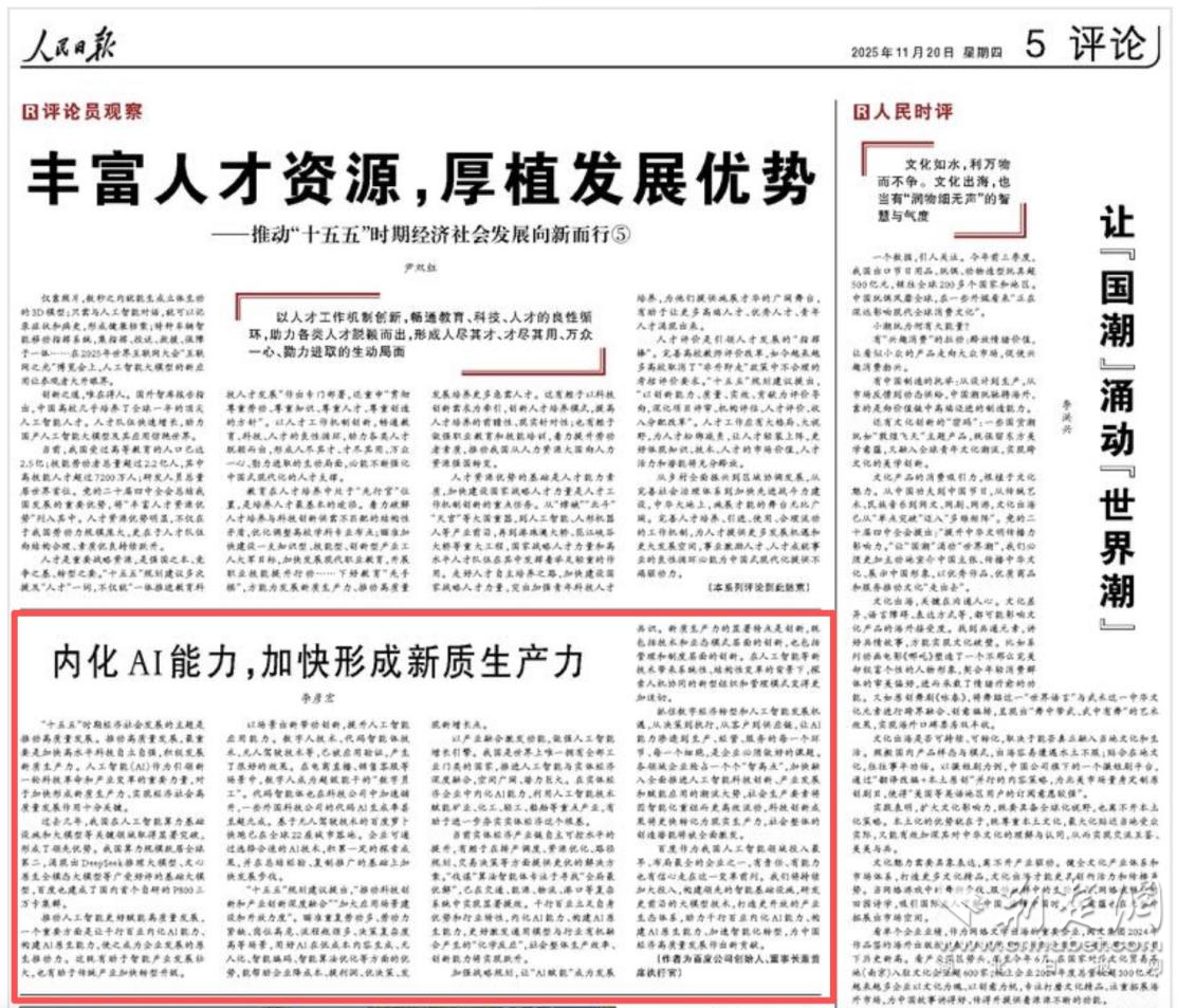 荊楚網(wǎng)(湖北日報(bào)網(wǎng))訊(通訊員 杜軒)11月20日,百度創(chuàng)始人、董事長兼首席執(zhí)行官李彥宏在《人民日報(bào)》發(fā)表題為《內(nèi)化AI能力,加快形成新質(zhì)生產(chǎn)力》的署名文章。他指出,推動(dòng)人工智能更好賦能高質(zhì)量發(fā)展,一個(gè)重要方面是讓千行百業(yè)內(nèi)化AI能力,構(gòu)建AI原生能力,使之成為企業(yè)發(fā)展的原生推動(dòng)力。