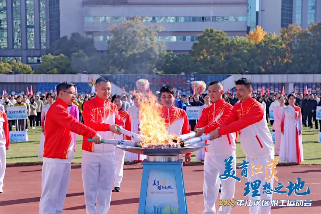 現(xiàn)場(chǎng),“新興之火”“數(shù)智之火”“金融之火”“樞紐之火”“人文之火”五棒火炬依次點(diǎn)亮,張?jiān)?、付俊、邵青、張寶劍、孟廣松等15位勞模代表接力傳遞。燃燒的火焰,照耀著江漢區(qū)在科技創(chuàng)新、數(shù)字化轉(zhuǎn)型、金融強(qiáng)區(qū)、商貿(mào)物流、文商體旅融合等發(fā)展領(lǐng)域堅(jiān)定向前。當(dāng)所有火炬手共同點(diǎn)燃主圣火盆,彩球騰空,全場(chǎng)沸騰,運(yùn)動(dòng)會(huì)正式開幕。