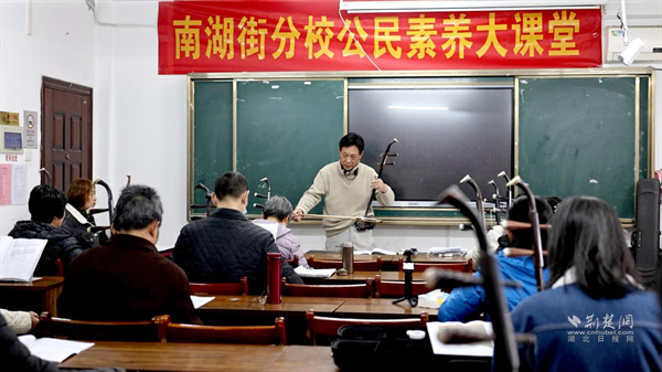 荊楚網(wǎng)(湖北日報網(wǎng))訊(記者 李燕 通訊員 羅嘉柯)早上九時,武昌區(qū)南湖街道一棟樸素的三層小樓已開始躍動起生活的韻律。二胡聲悠揚,葫蘆絲清亮,提著樂器的阿姨們步履輕快、笑意盈盈地走進樓內(nèi)。這里是南湖街老年大學,一個每日門庭若市、笑語盈窗的地方。每一位走進這里的老人,都仿佛推開了另一扇生活的門——門外是瑣碎日常,門內(nèi)卻是歌聲、筆墨、舞蹈與友誼。而這幅生機盎然的景象,離不開一位始終與他們并肩同行的人——校長李雨嘉。