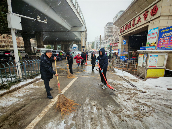紫陽(yáng)市場(chǎng)監(jiān)管所組織武泰閘市場(chǎng)及志愿者清雪除冰。 通訊員供圖