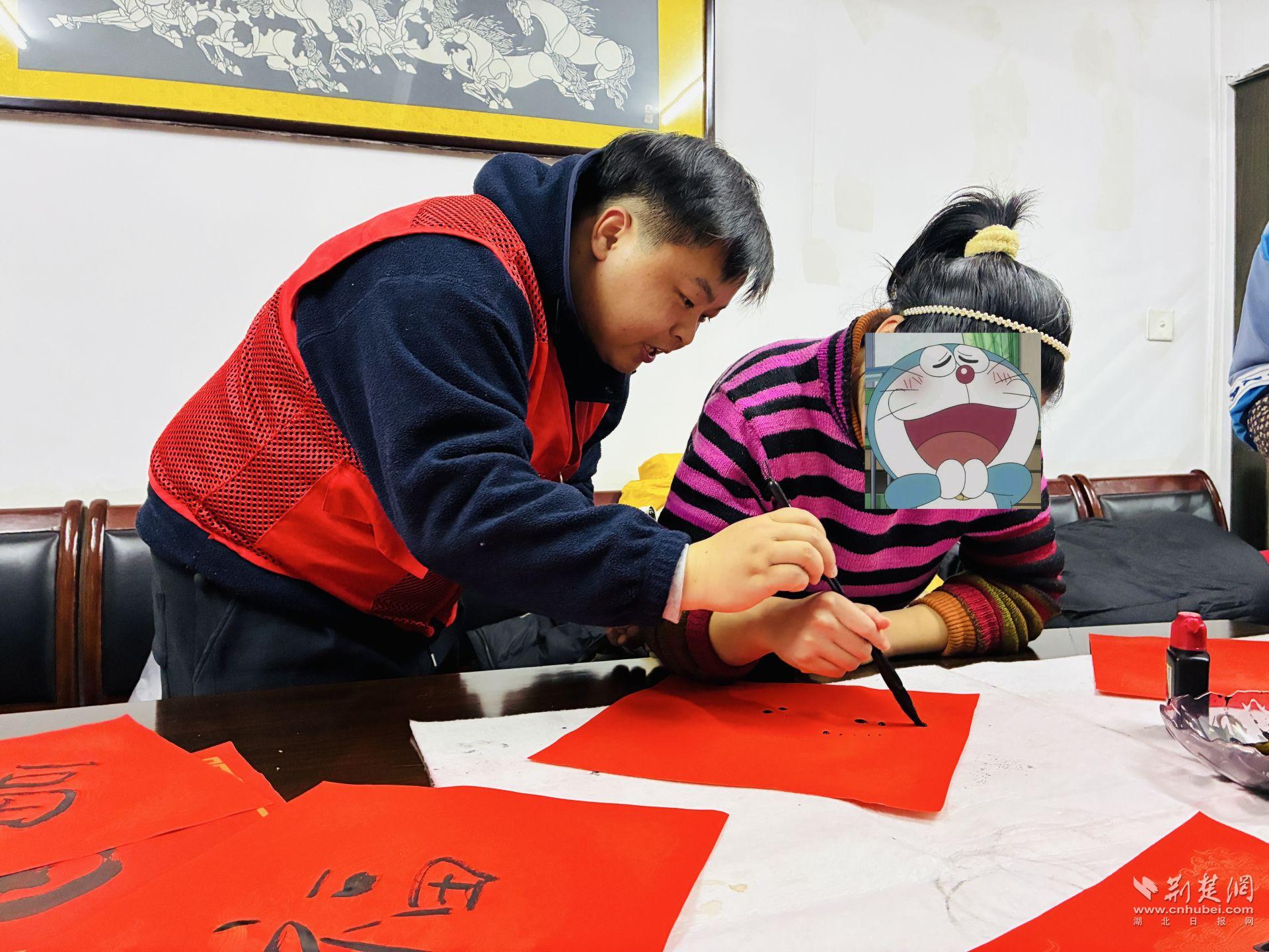 活動現(xiàn)場還設(shè)置了春聯(lián)書寫互動區(qū)。書法老師從握筆姿勢、用筆力度講起,耐心示范基礎(chǔ)筆法,并根據(jù)每個人的情況進(jìn)行指導(dǎo)。筆墨鋪展間,一副副春聯(lián)逐漸成形,內(nèi)容樸實(shí)真切,寄托著對新一年的期望。