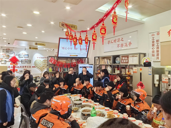 荊楚網(wǎng)(湖北日?qǐng)?bào)網(wǎng))訊(通訊員 趙坤 童霞)2月10日農(nóng)歷小年,武昌區(qū)南湖街道工會(huì)聯(lián)合中央花園社區(qū)、寶安社區(qū)在南湖街新就業(yè)群體服務(wù)工會(huì)驛站開(kāi)展“暖心小年,‘驛’起團(tuán)圓”活動(dòng),邀請(qǐng)外賣小哥、快遞員、環(huán)衛(wèi)工人等20余名戶外勞動(dòng)者歡聚一堂,寫福字、玩游戲、吃團(tuán)圓宴,在歡聲笑語(yǔ)中,感受工會(huì)“娘家人”的溫暖。