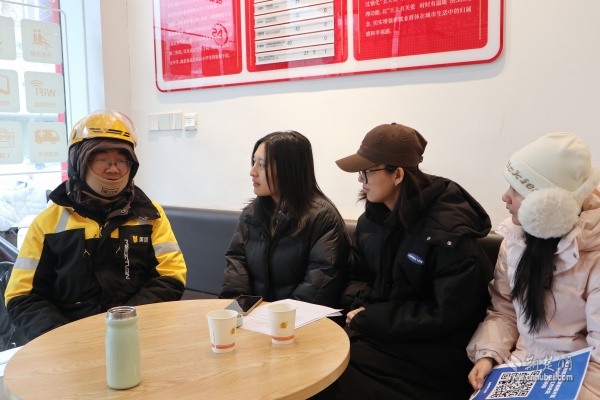調(diào)研期間,實(shí)踐隊(duì)在街道統(tǒng)籌安排下,深入街道新就業(yè)群體服務(wù)驛站、新業(yè)態(tài)站點(diǎn)及“暖新聯(lián)盟”商家,通過實(shí)地走訪、座談交流、問卷調(diào)研等形式,與一線騎手、站點(diǎn)負(fù)責(zé)人、社區(qū)工作者面對面溝通。他們詳細(xì)了解新就業(yè)群體工作生活狀況、現(xiàn)實(shí)需求與參與基層治理意愿,重點(diǎn)調(diào)研志愿積分激勵(lì)、“五大員”培育、“黃小蜂助老送餐隊(duì)”等特色項(xiàng)目的運(yùn)行成效。街道以服務(wù)型治理搭建信任紐帶、引導(dǎo)新就業(yè)群體融入基層治理的工作模式,為高校專業(yè)研究提供了鮮活的實(shí)踐樣本。