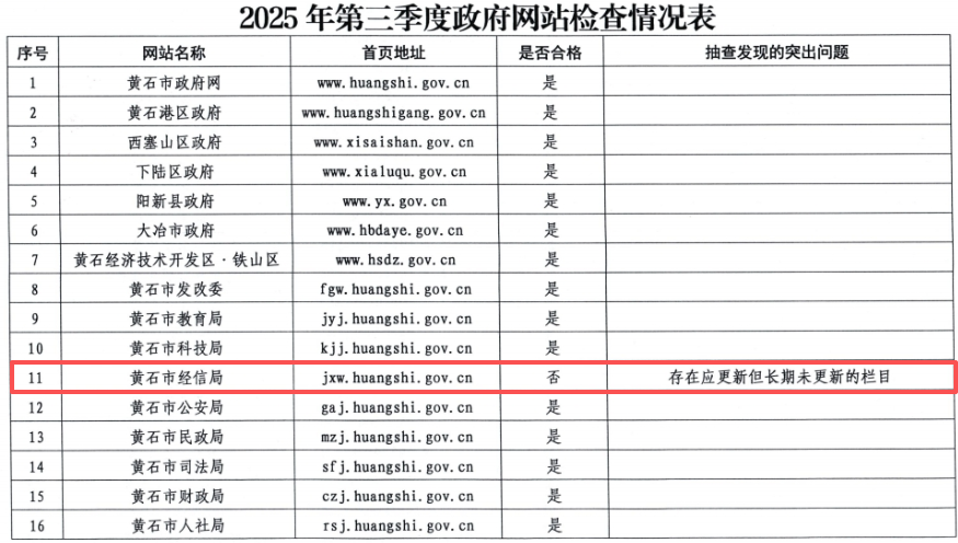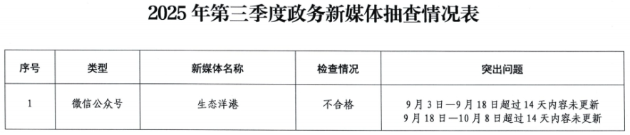 荊楚網(wǎng)(湖北日報網(wǎng))訊(記者 呂鑒蕾)記者24日獲悉,日前,黃石市政務(wù)服務(wù)管理局組織開展了2025年第三季度全市政府網(wǎng)站與政務(wù)新媒體檢查。其中,黃石市經(jīng)信局官網(wǎng)和“生態(tài)洋港”公眾號因日常維護(hù)管理不到位被點(diǎn)名。
