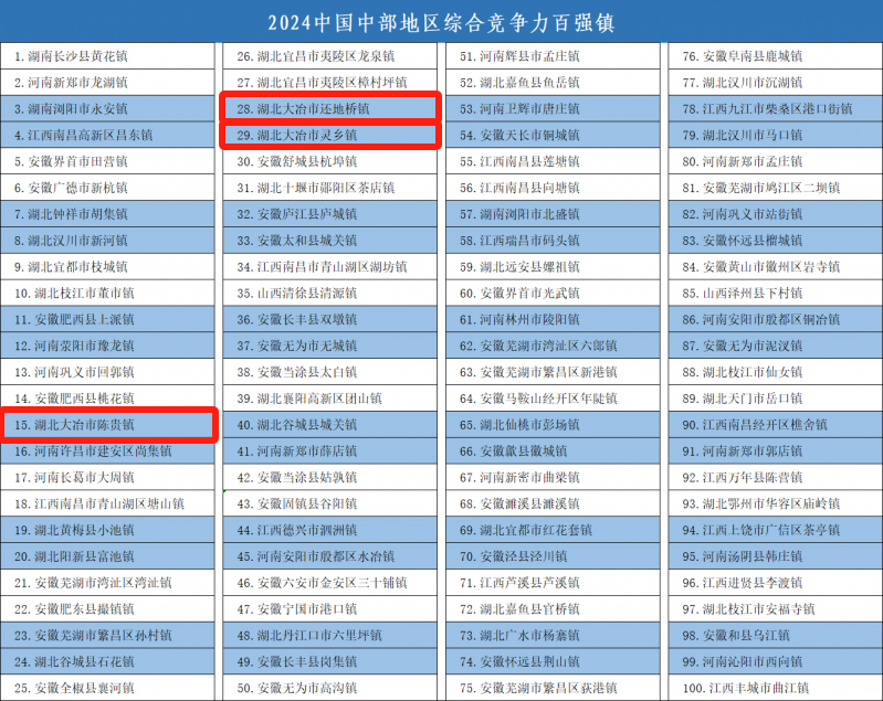 荊楚網(wǎng)(湖北日報網(wǎng))訊(記者左乙辰 通訊員 陳向東 羅蒙 范國安)近日,2024年鄉(xiāng)鎮(zhèn)高質(zhì)量發(fā)展交流會在湖南長沙召開,會上揭曉了2024年中國中部地區(qū)綜合競爭力百強鎮(zhèn)名單,大冶市陳貴鎮(zhèn)、還地橋鎮(zhèn)、靈鄉(xiāng)鎮(zhèn)上榜,分列第15、28、29位。