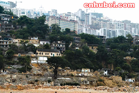 截?cái)辔咨皆朴,高峽出平湖。再過兩天,承載著億萬中國人夢想的三峽大壩135米蓄水就將開始,長江三峽一些人們熟悉的景觀將從此沉睡在煙波浩淼的高峽平湖之中。(左圖—)豐都老城廢墟上,一名婦女正逗孩子玩。遠(yuǎn)處是高樓林立的新縣城。