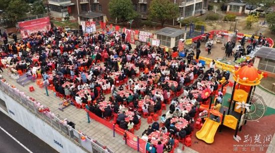 2月7日,臘月二十,咸安區(qū)浮山街道香城社區(qū)書苑小區(qū)廣場(chǎng)上,60張圓桌依次排開,700多位居民攜家?guī)Э诟斑@場(chǎng)鄰里之約,啤酒燒鴨的濃香、合菜面的爽口在空氣中交織,舞獅鑼鼓與歡聲笑語相映成趣。這場(chǎng)“我們的節(jié)日·春節(jié)”社區(qū)百家宴,正是咸寧社區(qū)文化節(jié)的生動(dòng)縮影。