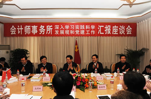 在座談會(huì)上,潘立剛同志分別聽取了王文童同志關(guān)于全省會(huì)計(jì)師事務(wù)所開展深入學(xué)習(xí)實(shí)踐科學(xué)發(fā)展觀活動(dòng)和注冊會(huì)計(jì)師行業(yè)黨建工作情況的匯報(bào),武漢市財(cái)政局總會(huì)計(jì)師、市財(cái)政局會(huì)計(jì)師事務(wù)所深入學(xué)習(xí)實(shí)踐科學(xué)發(fā)展觀活動(dòng)指導(dǎo)小組副組長張灼、襄樊市財(cái)政局副局長、市財(cái)政局會(huì)計(jì)師事務(wù)所深入學(xué)習(xí)實(shí)踐科學(xué)發(fā)展觀活動(dòng)指導(dǎo)小組副組長馬琦林、咸寧市財(cái)政局黨組成員、市會(huì)計(jì)師事務(wù)所深入學(xué)習(xí)實(shí)踐科學(xué)發(fā)展觀活動(dòng)指導(dǎo)小組副組長張麗華以及中勤萬信會(huì)計(jì)師事務(wù)所黨支部書記、董事長張金才,武漢眾環(huán)會(huì)計(jì)師事務(wù)所董事長、武漢市注冊會(huì)計(jì)師行業(yè)黨委副書記黃光松,咸寧永興會(huì)計(jì)師事務(wù)所所長、咸安區(qū)政協(xié)委員張麗平等同志先后匯報(bào)發(fā)言。大信會(huì)計(jì)師事務(wù)所湖北分所、中瑞岳華會(huì)計(jì)師事務(wù)所湖北分所、武漢興業(yè)會(huì)計(jì)師事務(wù)所、襄樊華炬會(huì)計(jì)師事務(wù)所黨支部書記也參加了此次座談。