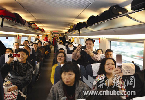 荊楚網(wǎng)消息 (楚天金報(bào)記者譚新杰 通訊員郭金富、劉強(qiáng))12月26日上午9時(shí),三列嶄新的時(shí)速350公里“和諧號(hào)”高速列車(chē)從武漢站、長(zhǎng)沙站和廣州北站同時(shí)首發(fā),標(biāo)志著目前世界上運(yùn)營(yíng)速度最快、一次性建成里程最長(zhǎng)的高鐵新干線——武廣客專(zhuān)正式投入運(yùn)營(yíng)!瓣懙仫w行下廣州,千里南國(guó)一日還”的時(shí)代已經(jīng)到來(lái)。
