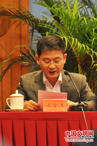 人民網(wǎng)總裁兼總編輯廖玒代表全國(guó)百家網(wǎng)站宣讀《爭(zhēng)創(chuàng)“文明網(wǎng)站”倡議書》。