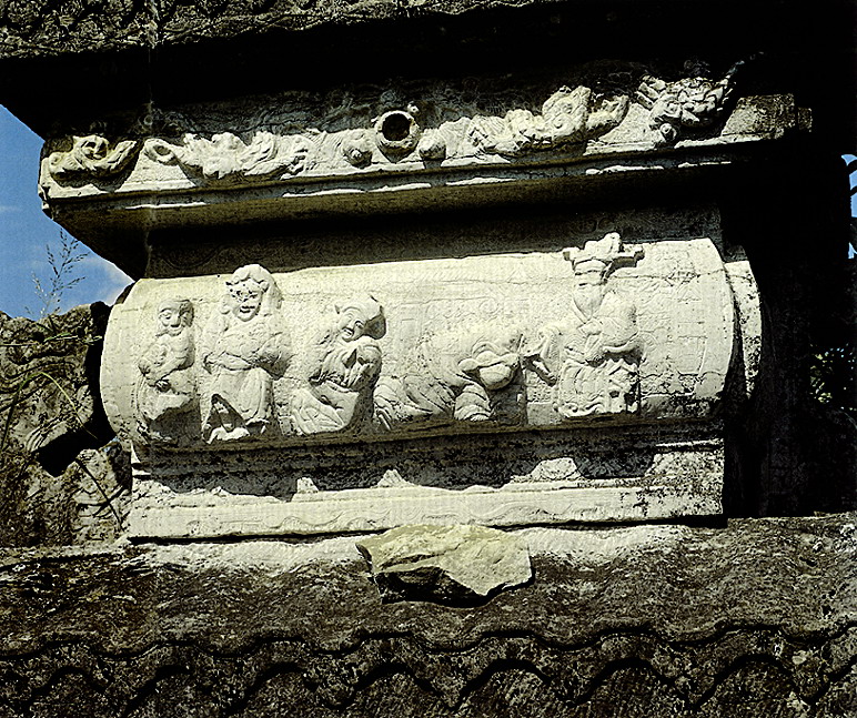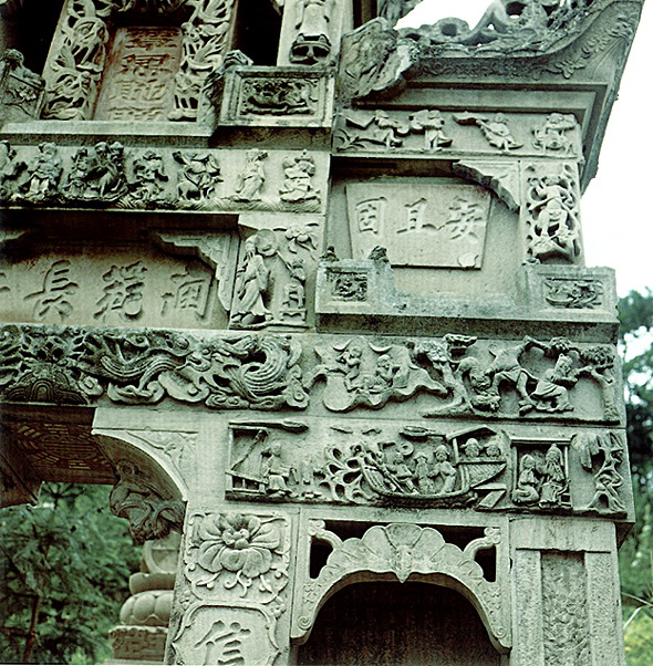 石雕 湖北省北有秦嶺東沿的武當山、大別山、桐柏山,西接云貴高原,東南為幕阜山脈環(huán)繞,中部是寬闊的江漢平原。山區(qū)產石料,為石雕提供了豐富的用材;平原燒泥土制磚瓦,鐫以圖案美化建筑。民間石雕、磚雕分布,與地形大體一致。?凳耦}材廣泛,大致分為日常生活、倫理教化、神話傳說、戲文故事、花鳥蟲魚、書文楹聯(lián)六類。